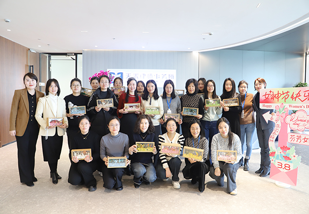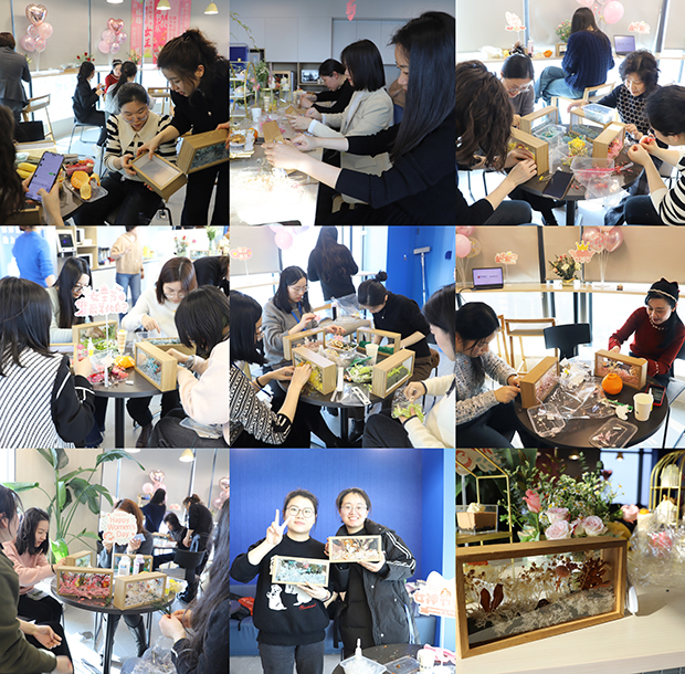 永生花象征恒久的美好祝愿。活动中,同事们发挥巧思和艺术创作,精心将处理过的玫瑰、茉莉等永生花材与枝叶、装饰品巧妙组合,定格在透明相框里,让内心寄情于花草之间,沉浸静谧的美好时光,体验一次心灵的滋养和洗礼。不同的花材搭配呈现出各具特色的作品,也恰如每位职业女性独特的职场风采。