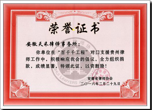 近日,安徽省律师协会向本所颁发荣誉证书,表彰本所在“百千千工程”对口支援贵州律师工作中,积极响应省律协倡议,全力组织捐款,成绩显著。