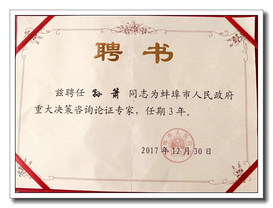 近日,本所合伙人孙箫律师受聘担任蚌埠市人民政府重大决策咨询论证专家,任期3年。